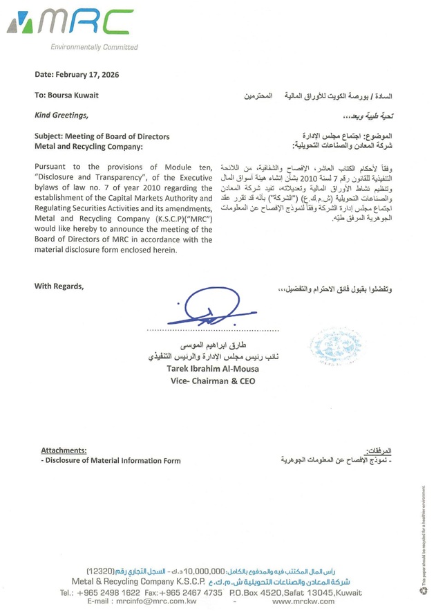 مجلس الإدارة يجتمع في 19 فبراير 2026