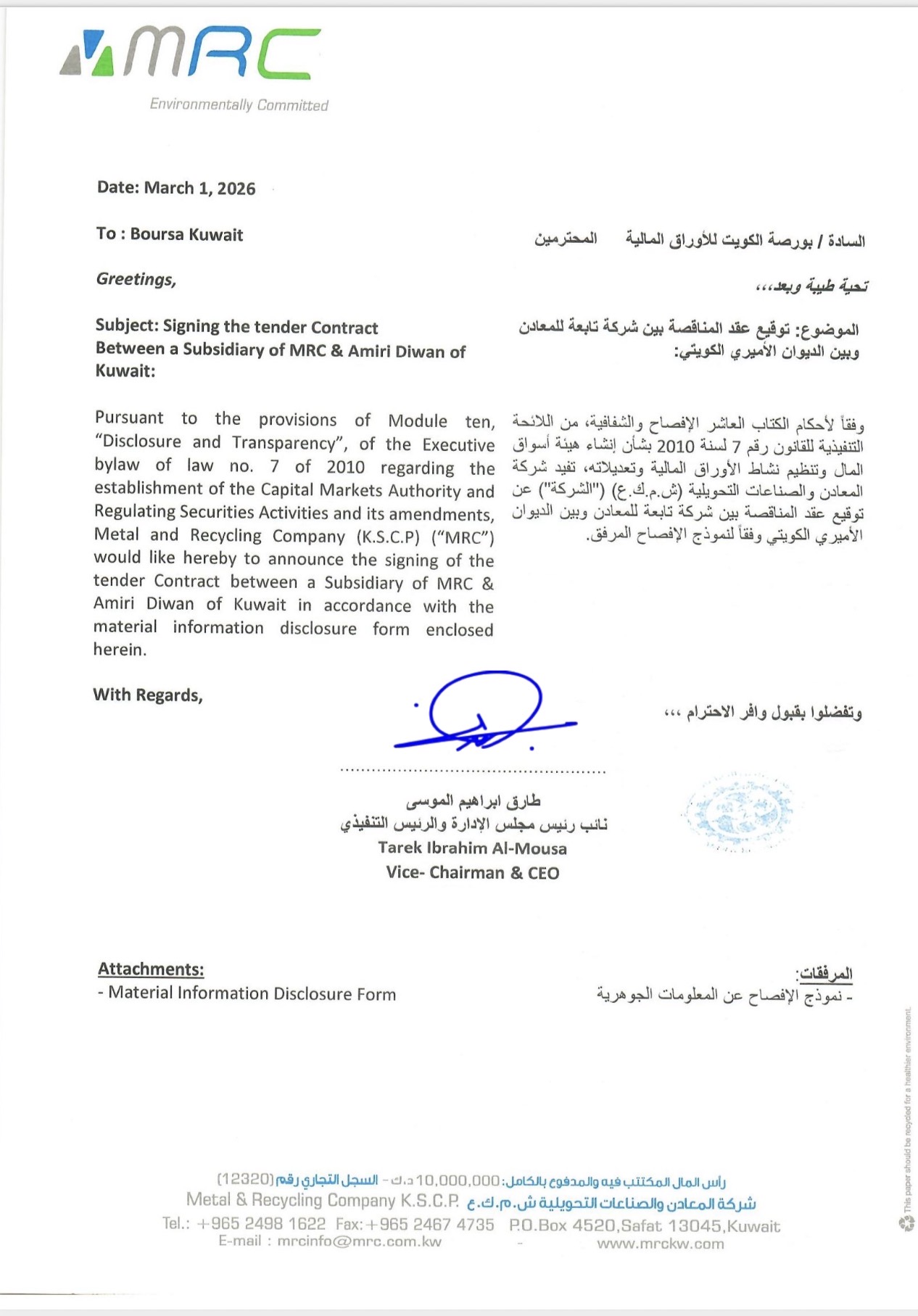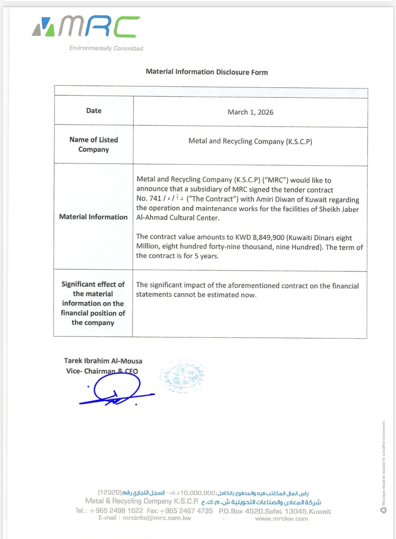 Signing The Tender Contract Between a Subsidiary of MRC & Amiri Diwan of Kuwait