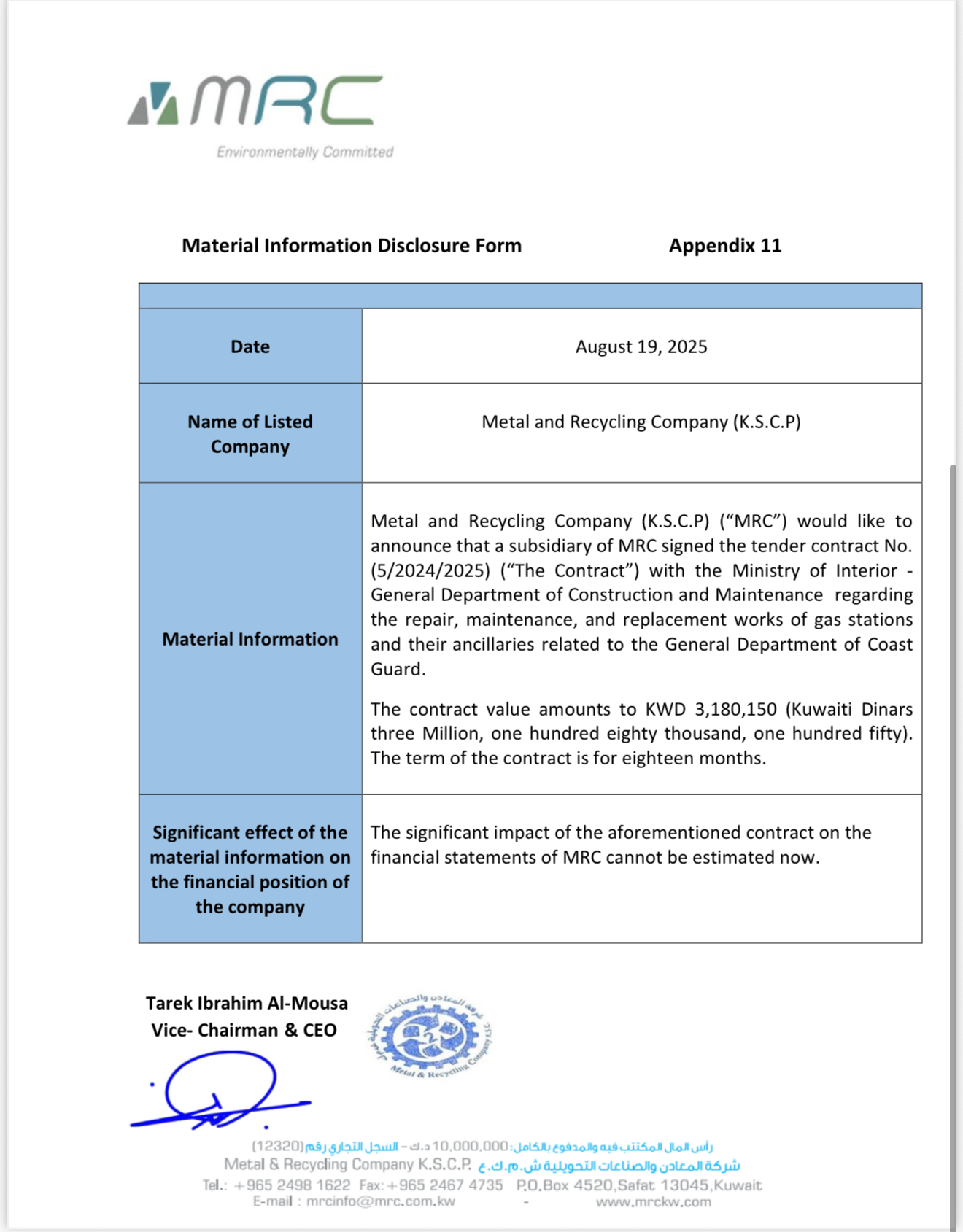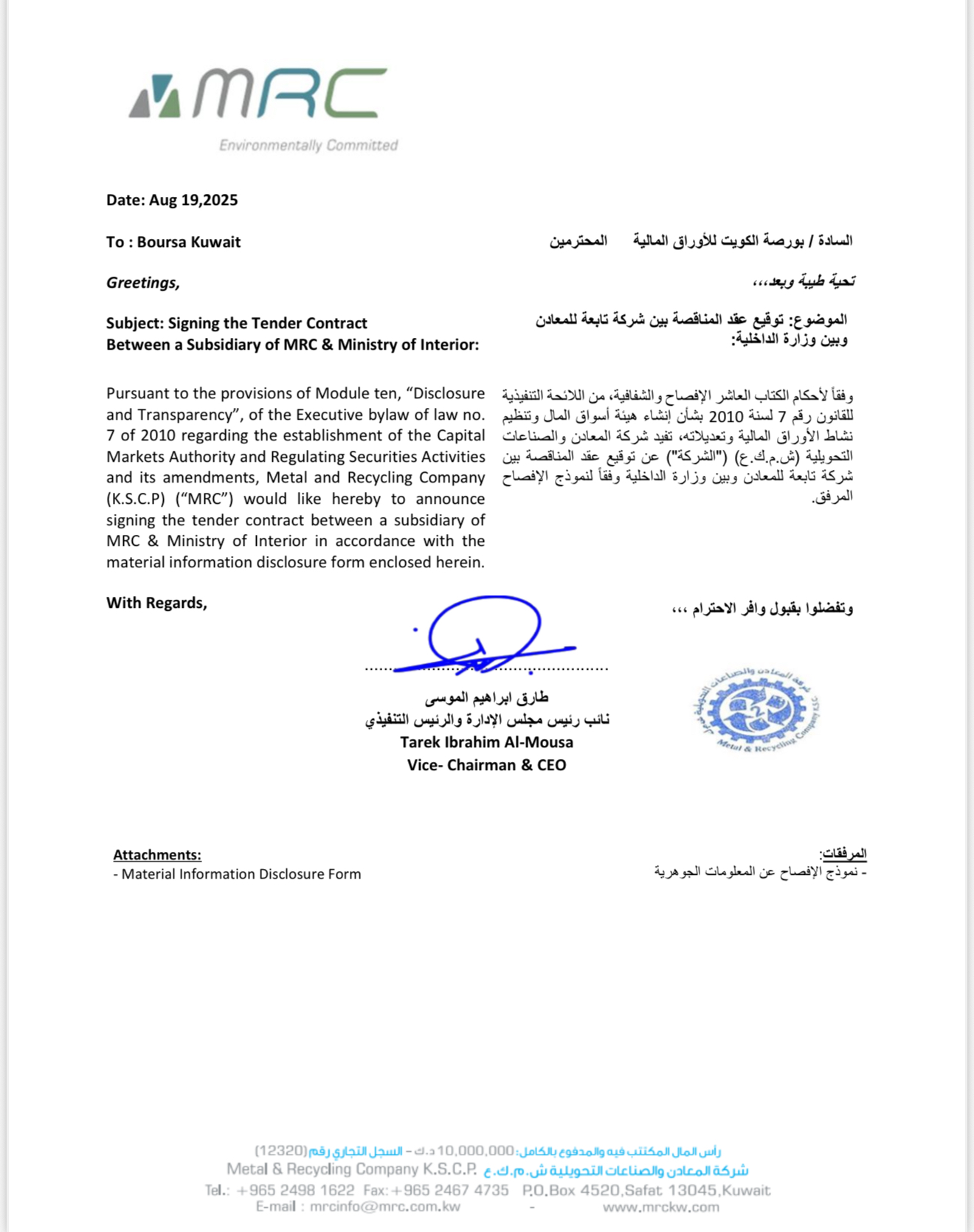 Signing the Tender Contract Between a Subsidiary of MRC & Ministry of Interior